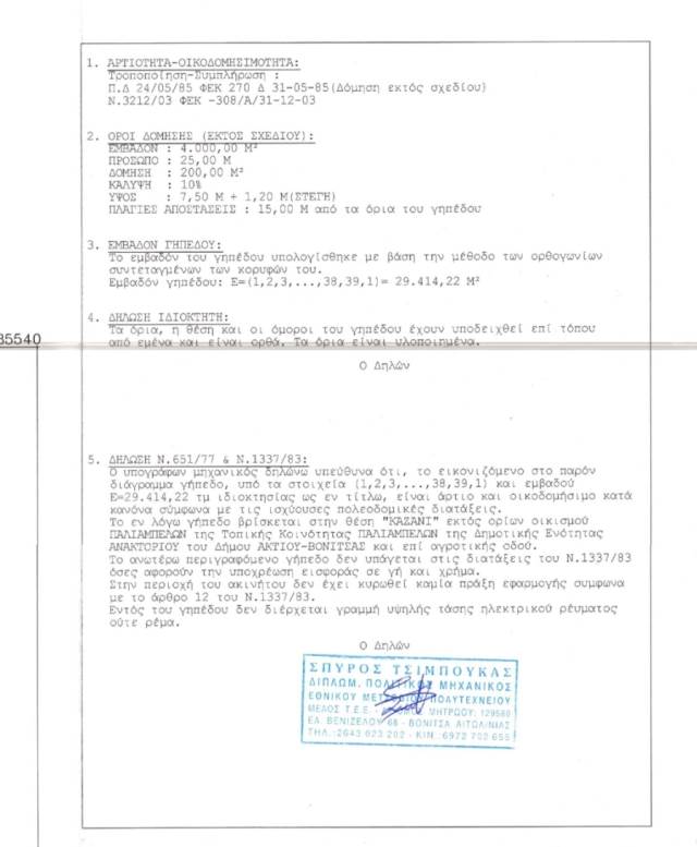 Προς Πώληση, Ανακτόριο, Βόνιτσα, Οικόπεδο εκτός σχεδίου, 29.414 τ.μ, χαρακτηριστικα: Οικοδομήσιμο, Περιφραγμένο, Επενδυτικό, Προσόψεως, Για τουριστική εκμετάλλευση, Κατάλληλο για αγροτική χρήση, 300μ. από Χωριό Παλιάμπελα,οικόπεδο 29.414τμ,με 0,18Σ.Δ.(χτίζει 200μ.),και ύψος 7,5μ. συν 1,2μ. στέγη,και 10% κάλυψη,με 512 ρίζες ελιές, Σ.Δ: 0,18, Σ.Κ: 10 Εκτός σχεδίου , κοντά σε: Εκκλησία,Αγορά,Σχολείο, απόσταση απο: Αεροδρόμιο(m): 22000, Θάλασσα(m): 4000, Πόλη(m): 7000, Χωριό(m): 300, τιμή: 250.000€. ΜΕΣΙΤΙΚΟ ΤΣΑΟΥΣΗΣ - ΣΤΑΥΡΟΠΟΥΛΟΣ Ο.Ε., Καλλιρόης 41 Αθήνα- Φιξ, Τηλ: 2109224657, e-mail: info@mesitiko-athens.gr
